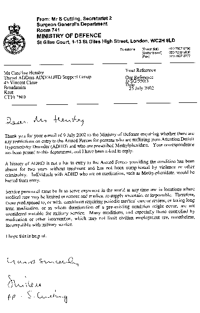 Thank you for your email of 9 July 2002 to the Ministry of Defence enquiring wither there are any restrictions on entry to the Armed Forces for persons who are suffering from Attention Deficit Hyperactivity Disorder (ADHD) and who are prescribed Methylphenidate. Your correspondence has been passed to this department and I have been asked to reply.
