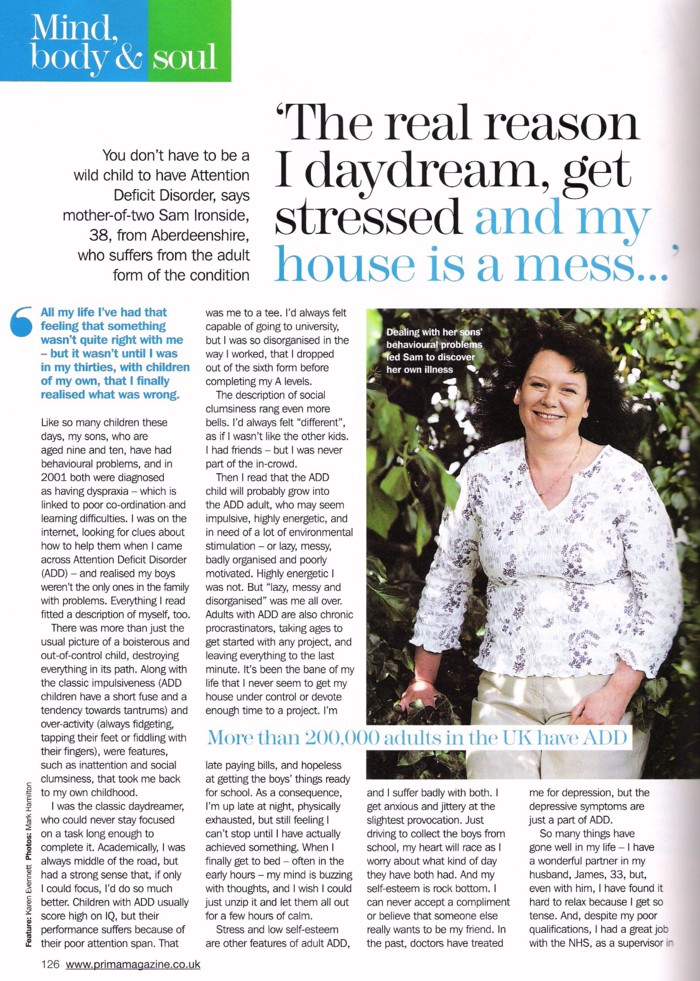 A few months ago I was contacted by a Free Lance Journalist asking if I would be able to put her in touch with an Adult who had been diagnosed with ADD/ADHD as an Adult. Well Sam who is a regular member of adders.org Forums very kindly agreed to speak to her and this has resulted in this fantastic article in the August Edition of Prima Magazine.