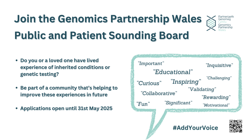 Rebecca wrote to us as follows:Genomics Partnership Wales are currently looking for individuals who have experience caring for someone with an inherited condition and/or have experience of developmental delay disorders or experience as a carer to join their Public and Patient Sounding Board in 2025.